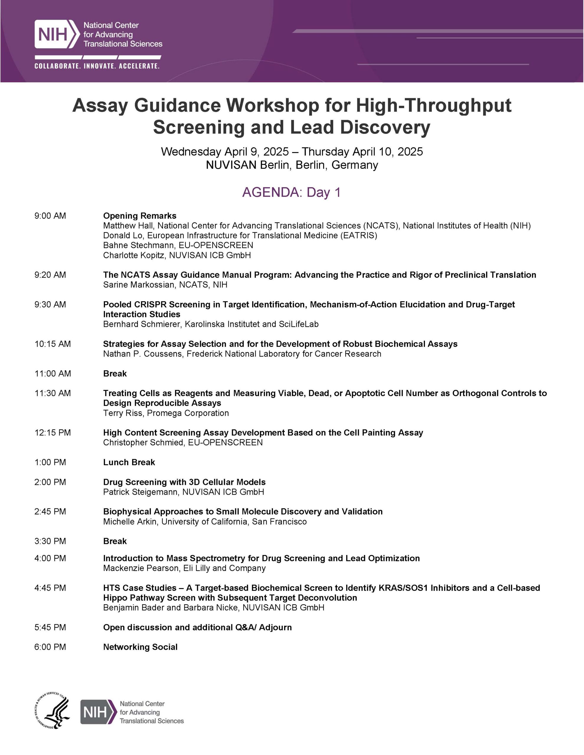 The NCATS Assay Guidance Workshop for High-Throughput Screening and Lead Discovery will be held in person on 9-10 April 2025, at NUVISAN Innovation Campus Berlin in Berlin, Germany.